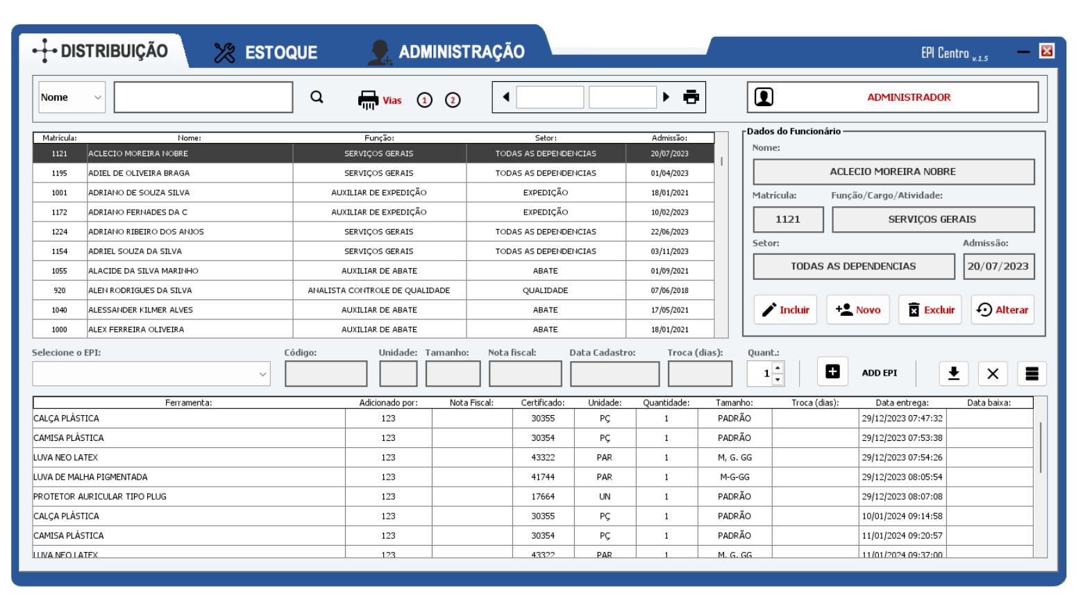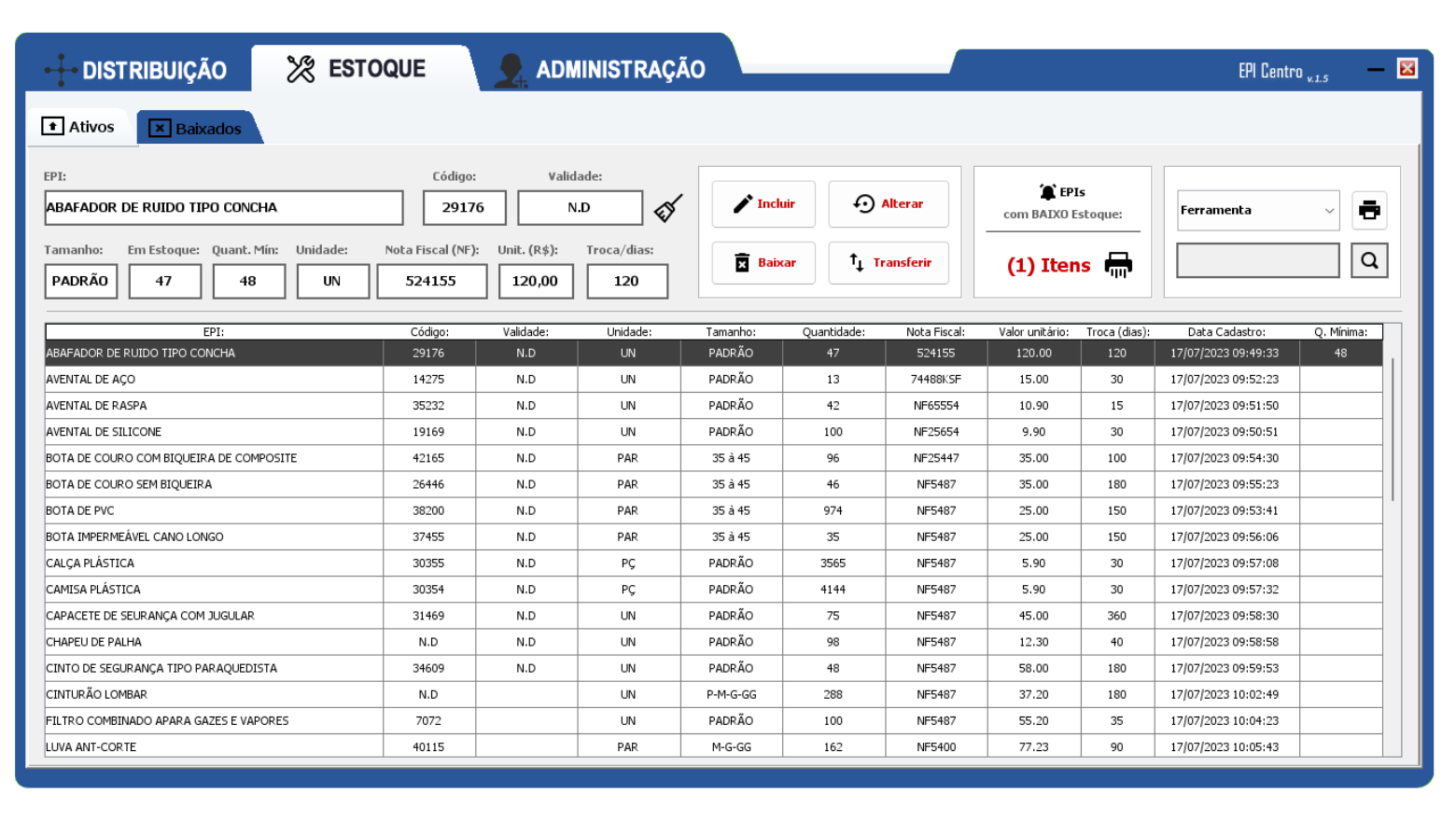 • Controle de Validade do EPI em Uso: Monitoramento da vida útil do equipamento que está com o funcionário. O sistema avisa quando é hora de trocar.